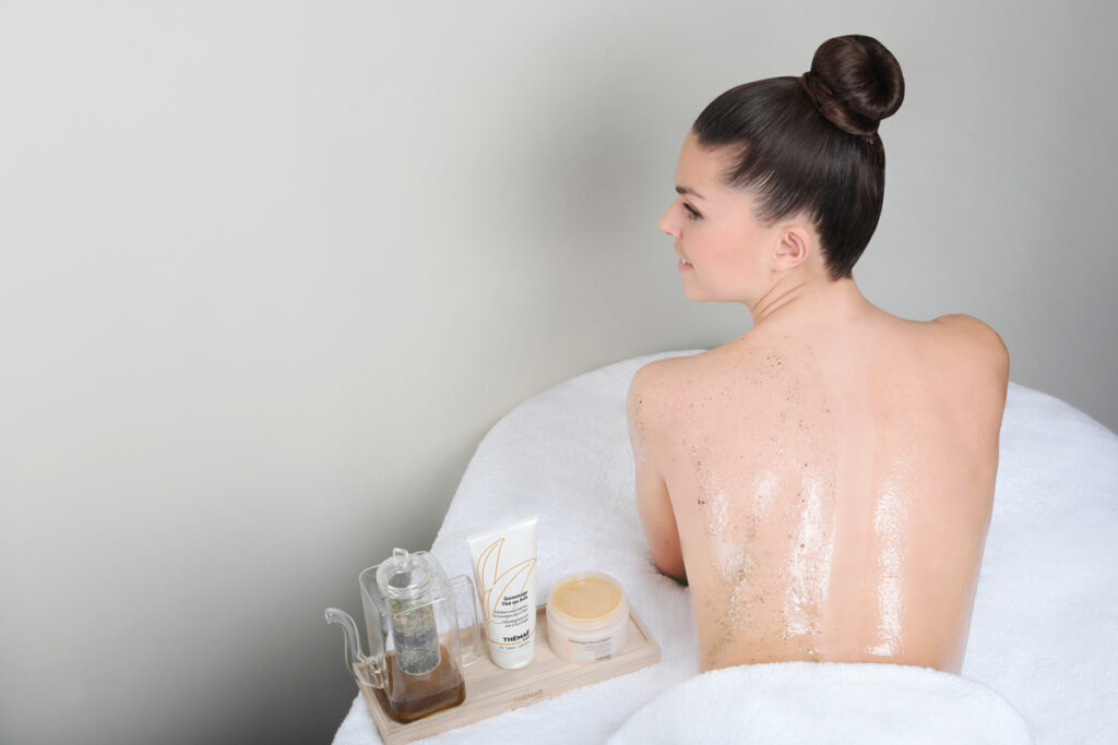 Le + du soin 1h30 : application d’un enveloppement au Thé Vert Amincissant aux vertus drainantes et détoxifiantes.